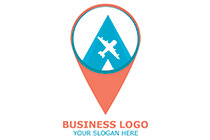 mountain, location pin and aeroplane logo