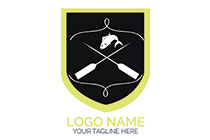 harpoons, fish and rope in a shield logo