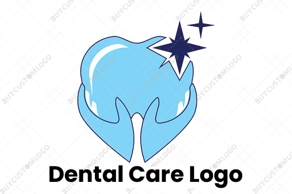 LOGO DESIGN DESCRIPTION It is a customized logo created using the emblem of a tooth incorporated with abstract hands that represent care with sparkles that symbolize hygiene. Suitable for dentists and dental clinics.