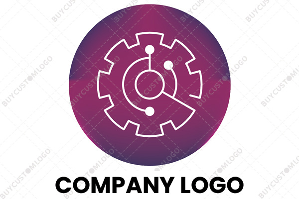 LOGO DESIGN DESCRIPTION This is a customized logo which combines a gear and networking lines designed using a continuous line encompassed in a round seal made with gradient purple colour. Suitable for software companies, automobile listing websites, applications that provide car repair services, engineering firms, mechanics as well as automotive forums, blogs, podcasts and youtube channels.
