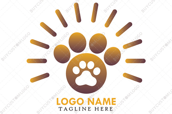 LOGO DESIGN DESCRIPTION This is a customized logo created using the emblems of dog paws, one incorporated with the other integrated with rays which gives it a sun theme. Golden is used with gradience in the design however it could be reproduced in any flat colour of your choice without the loss of quality. Suitable for pet shops, vets, animal rescue as well as other related businesses.