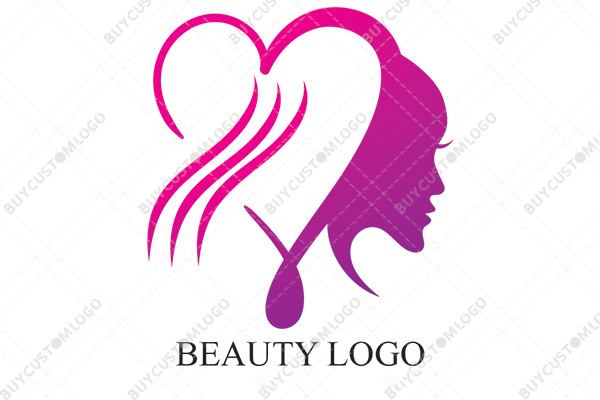 LOGO DESIGN DESCRIPTION This is a customized logo created with the face of a lady integrated with a heart and hairs in line style, designed with indigo and pink colours in gradience. Highly suitable for businesses targetting the female audience such as beauty salons, clothing and accessories shops.