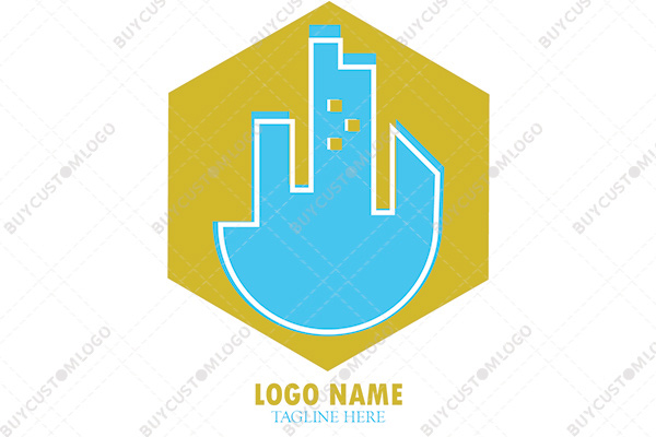 LOGO DESIGN DESCRIPTION This is a customized logo created using the emblem of a rigid abstract building which is encompassed in a hexagon seal designed with golden yellow and blue as the primary colours which gives the design beach theme. Suitable for resorts and hotels on or near waterfronts.