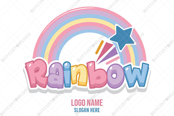 LOGO DESIGN DESCRIPTION It is a customized logo created using the emblems of a star, circular lines, sparklings and typography Rainbow designed with lighter versions of pink, purple, blue and yellow. The design could be reproduced with any typography of your choice without the loss of quality. Its visuals give it a visually appealing look which makes it highly suitable for businesses catering to children such as candy stores, icecream shops, clothing, nurseries as well as other businesses.