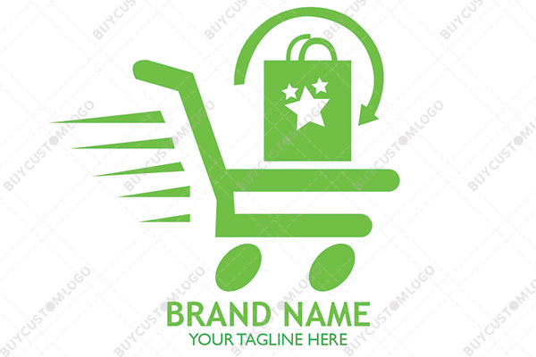 LOGO DESIGN DESCRIPTION This is a customized logo of a shopping cart created with linework which is integrated with oval tires and thick to thin lines that symbolize speed, a circular arrow that represent eco-friendliness and a bag with stars symbolizing excellence. The design will communicate agility and love of nature for your brand. It could be reproduced flat in any colour of your choice without the loss of quality. Highly suitable for retail and e-commerce businesses.