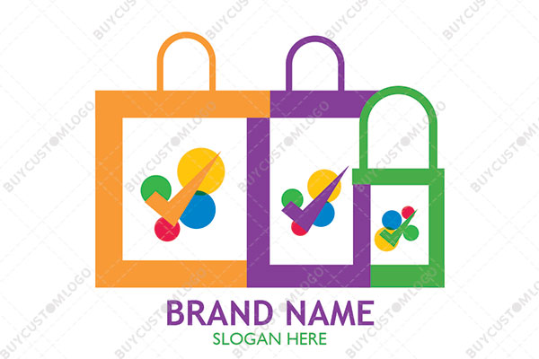 LOGO DESIGN DESCRIPTION This is a customized logo of shopping bags created using linework, which are merged together and incorporated with circles that symbolize the goods purchased and checkmarks symbolizing their quality. Blue, pink, orange, yellow and green colours are used in the design which gives it a highly visually appealing look ensuring high engagement for your brand. Highly suitable for retail and e-commerce businesses.