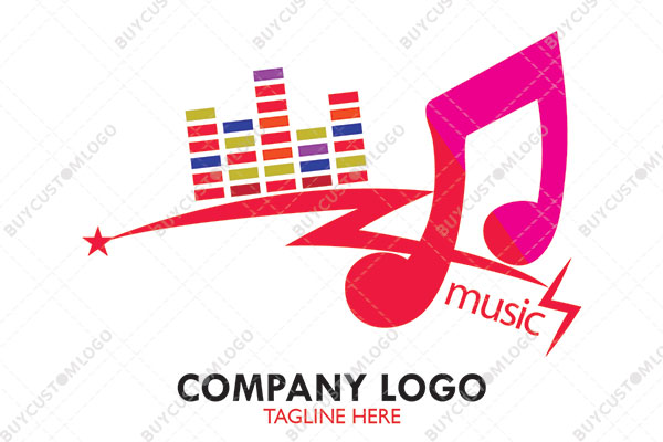 LOGO DESIGN DESCRIPTION This is a custom logo created using the emblem of bolts, which are integrated with graphical visualization, star and eighth note along with typography music. The design will communicate fun, energy and excitement for your brand. It is designed with green, blue, orange, purple and multiple shades of pink but could be reproduced in any colours and with any letters of your choice without the loss of quality. Suitable for bands, recording studios, record labels as well as other related entities.