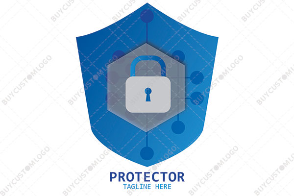 LOGO DESIGN DESCRIPTION This is a custom logo created using the emblem of networking nodes that symbolize technology, which are incorporated in a shield along with a lock and hexagon symbolizing security and protection. Multiple shades of blue and grey are used in the design however it could be reproduced flat in any colours of your choice without the loss of quality. Suitable for businesses related to cybersecurity but could be used by others as well.