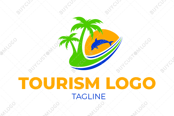 | Exclusive Logo 3257, An Island with Palm Tree’s, Ocean, Dolphin, and Horizon Logo