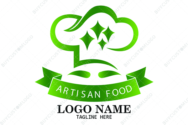 LOGO DESIGN DESCRIPTION Customized logo created using the emblems of a chef hat and stars to represent excellence and service with a moustache to make it unique and a ribbon to give it a complete look. The green colour is used in the design to give it a natural look. Suitable for restaurants offering healthy and organic foods.