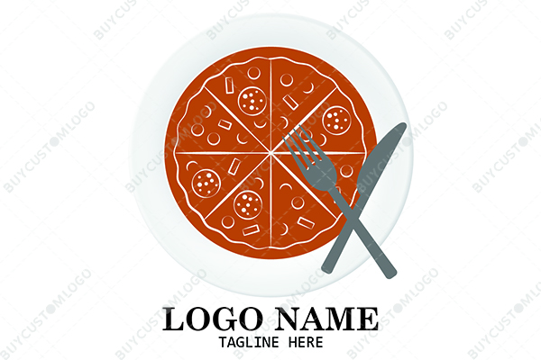 LOGO DESIGN DESCRIPTION A pizza that also looks like a pie is placed on a plate along with a knife and fork to create this customized logo. Suitable for restaurants, cafes as well as other businesses serving any of these or both as their speciality.