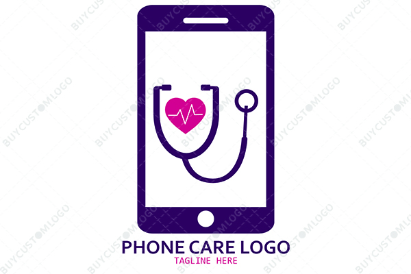 LOGO DESIGN DESCRIPTION A customized logo created using the emblem of a heart with ECG lines representing life and health along with stethoscope which symbolizes healthcare encompassed in a smartphone indicating the use of technology. Pink and indigo colours are used in the design to give it a vibrant look. Suitable for applications of this category, clinics as well as phone repair shops.