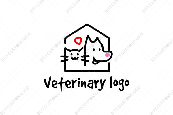 LOGO DESIGN DESCRIPTION This custom logo is made with the character of a cat and a dog in a hut created using two continuous lines that meet each other integrated with irises, smiley, nose and a heart. Suitable for animal shelters, vets and pet stores.